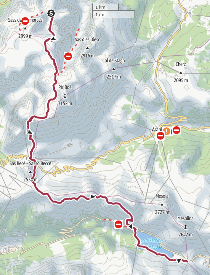 The Marmolada, the highest mountain in the Dolomites, and its glacier. At the feet of the massif you can see the Fedaia lake, around which there are a couple of huts, including the one where we are staying tonight. In the distance you can see the Pelmo and the Civetta.