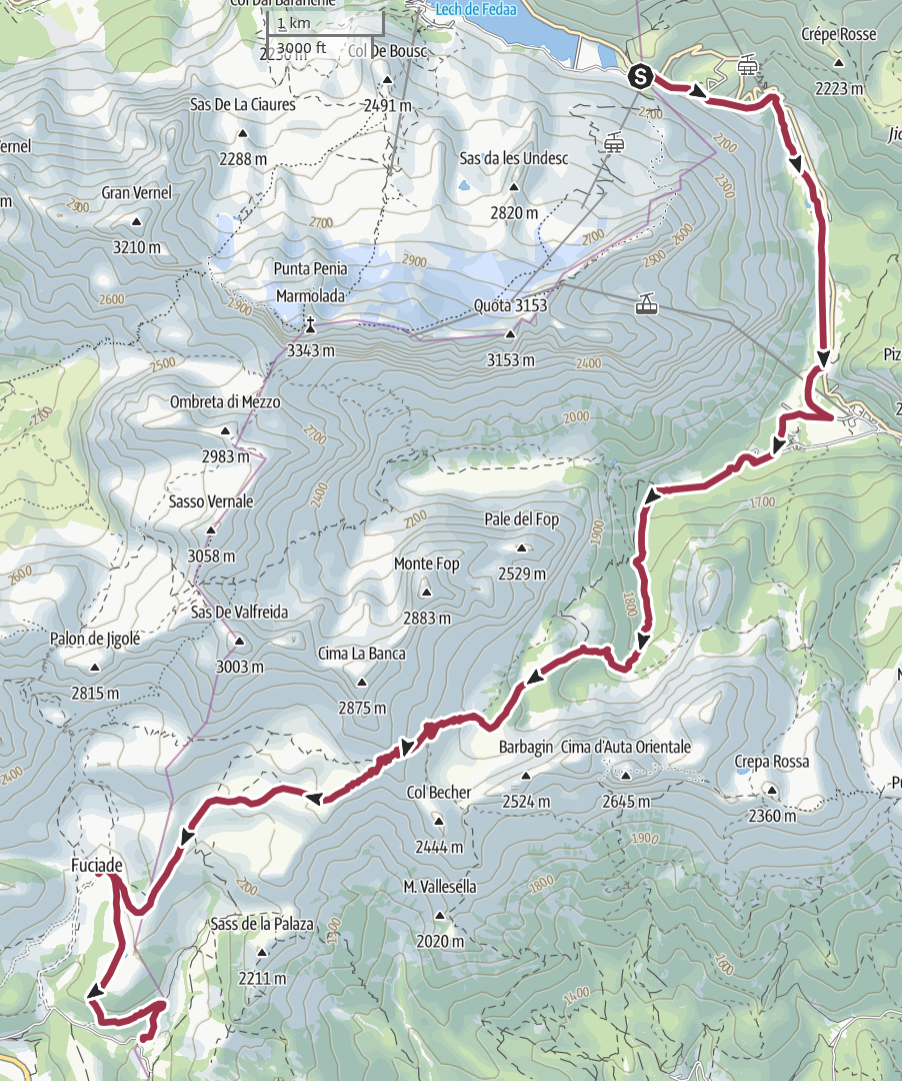 There is a great view on both sides of this pass, but the wind is cold and strong and we are not keen on staying long. After eating a couple of protein bars and taking many pictures, we start walking down towards Fuciade at 13:40.