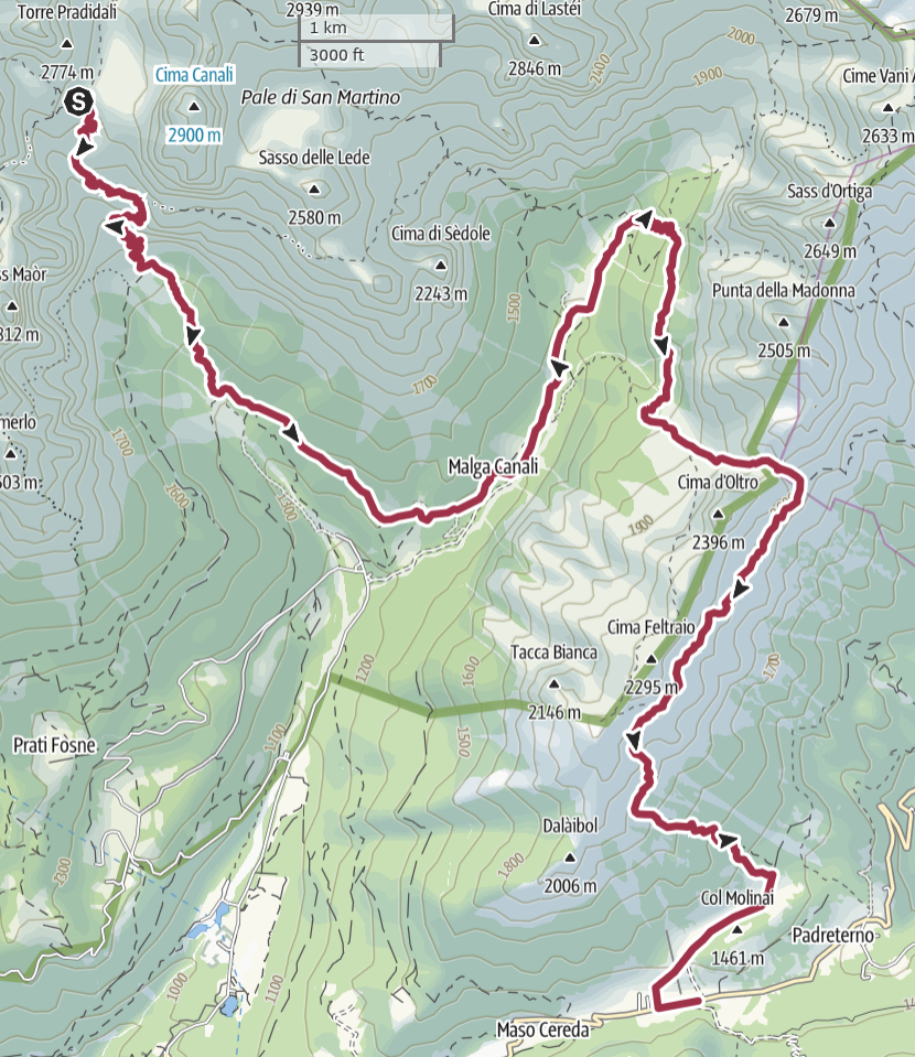 Last night we had to check our maps, because we were not sure which route we would be going, according to our plan. We did not remember that the guide book suggested two possible alternatives to reach the next hut, Rifugio Treviso: a higher mountain trail, with some challenging sections, and an easier one that starts by walking down the Val Canali, a valley that leads out of the Pala group and into the Vette Feltrine mountain range. Our plan was to follow the easier route, and we decided to stick to it.